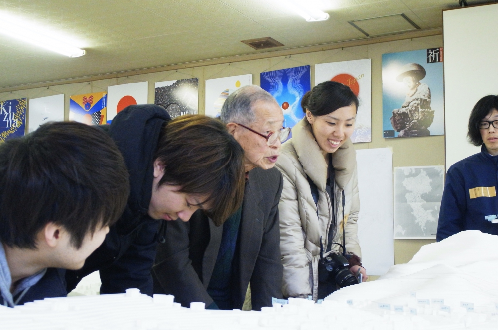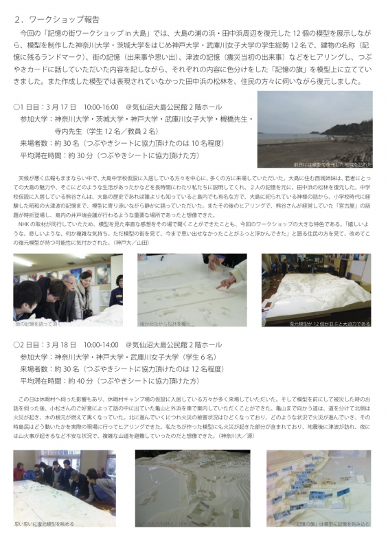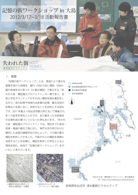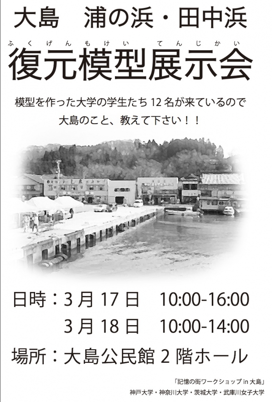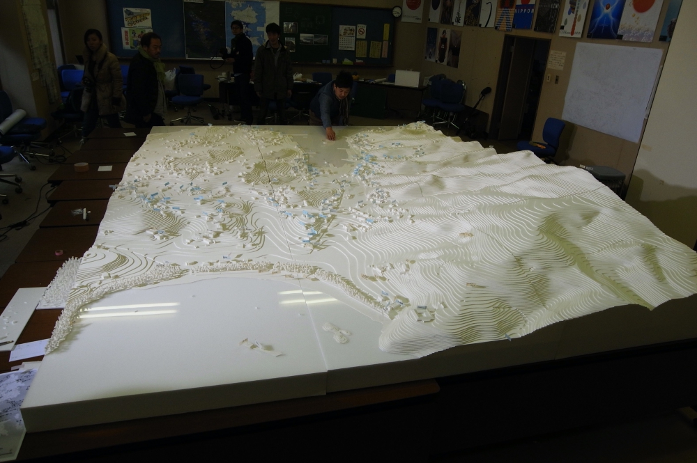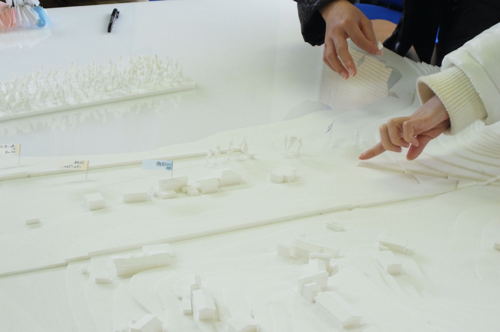 気仙沼大島の復興支援に入るにあたり、被災地の地域性や被災状況を理解することを目的として、東京都現代美術館の展示の際に神奈川大学曽我部研究室・信州大学寺内研究室で製作した気仙沼大島の浦の浜・田中浜地区の復元模型を用い、記憶の街ワークショップを行いました。