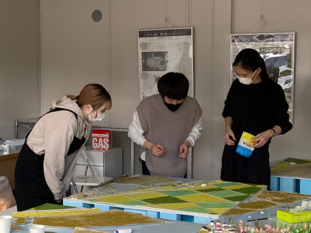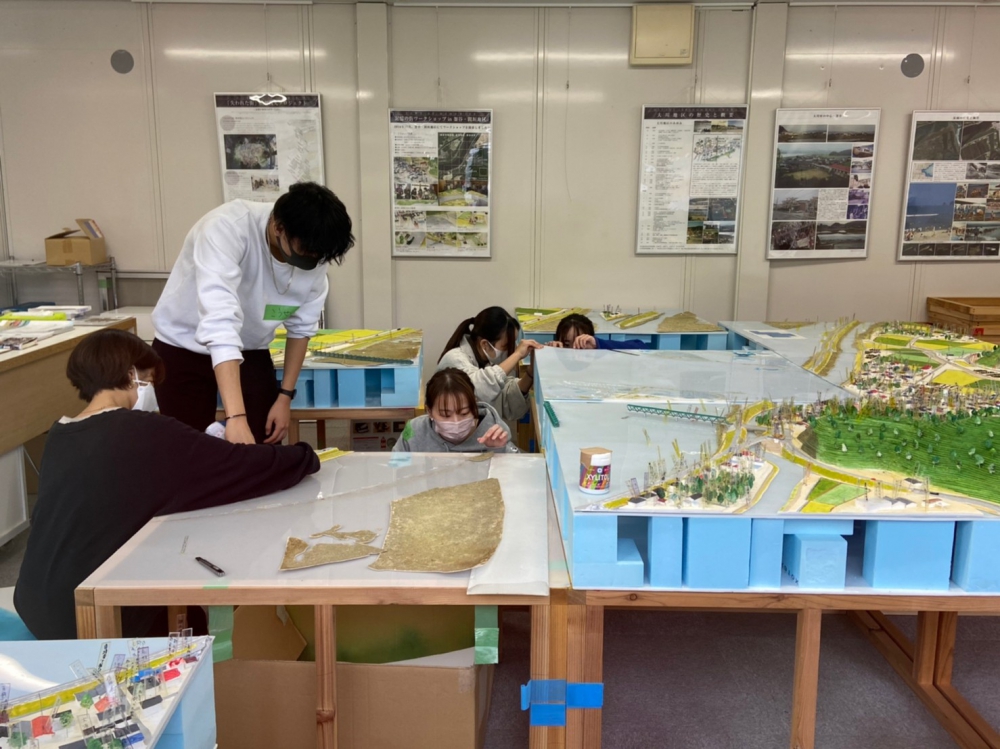 また、同時に大川地区の釜谷・間垣地区(大川小学校付近)の復元模型の修理を、神戸大学・愛知淑徳大学・宮城大学の学生が行なっておりました。愛知淑徳大学の久保井 聡先生も引率として来られました。