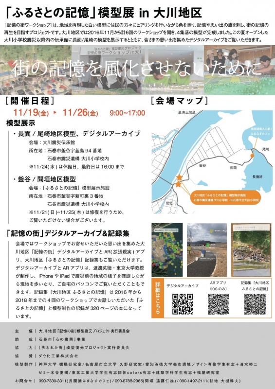 | 会場 | 長面・尾崎地区模型展示:大川震災伝承館 釜谷・間垣地区模型展示・補修:「ふるさとの記憶」模型展示施設 |