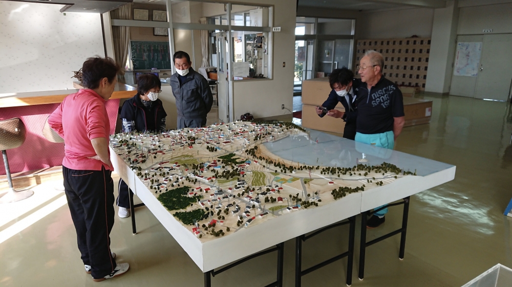 搬入された際、ちょうど開発総合センターで卓球をされている住民の方々がおられ、その方々が搬入したばかりの模型に目を止めて、模型を見ながらワイワイ話されており、早速喜んでいただけたようでした。